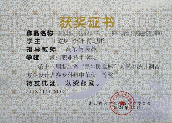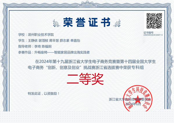 赵浩喆,2025届跨境电子商务专业毕业生,共青团员。在校期间,荣获第十八届“挑战杯”全国大学生课外学术科技作品竞赛国家级三等奖,2023-2024年度国家奖学金,2022-2023年度省政府奖学金,浙江省经济管理案例竞赛一等奖,浙江省大学生电子商务竞赛二等奖,以及湖州侨资商会勤学奖学金等多项荣誉。获得实用新型专利2项,计算机软件著作权登记证书2个。