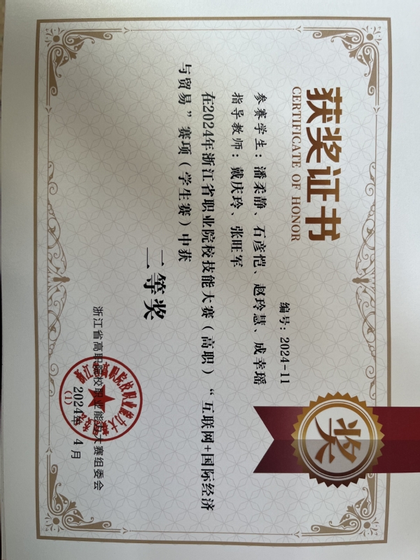 专业依托教育部骨干专业国际经济与贸易,建设基础扎实,建设成果突出。跨境电商人才培养项目《“五维度标准”引导跨境电商人才培养探索与实践》获浙江省教学成果奖一等奖;入选2024年度浙江省高校重大人文社科攻关计划项目一个;获评全国AI跨境电商行业产教融合共同体副理事长单位。教师和学生在各类专业和创新创业竞赛中成绩突出。